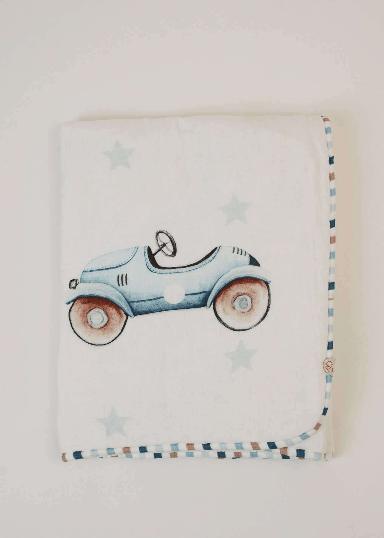 تم تصميم هذه البطانية الرائعة لتنقل طفلك إلى عالم من المغامرة والحنين إلى الماضي، حيث تلتقي إثارة مضمار السباق مع راحة الدفء.