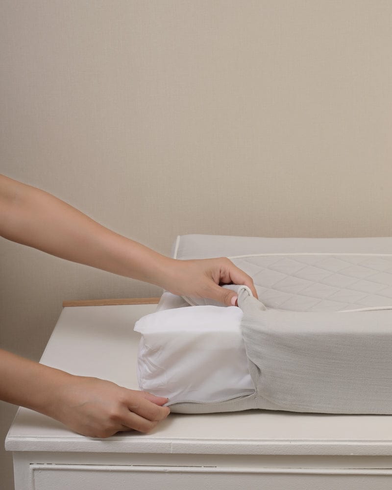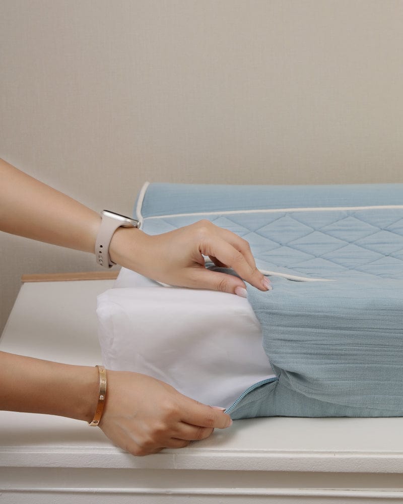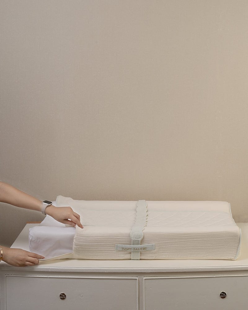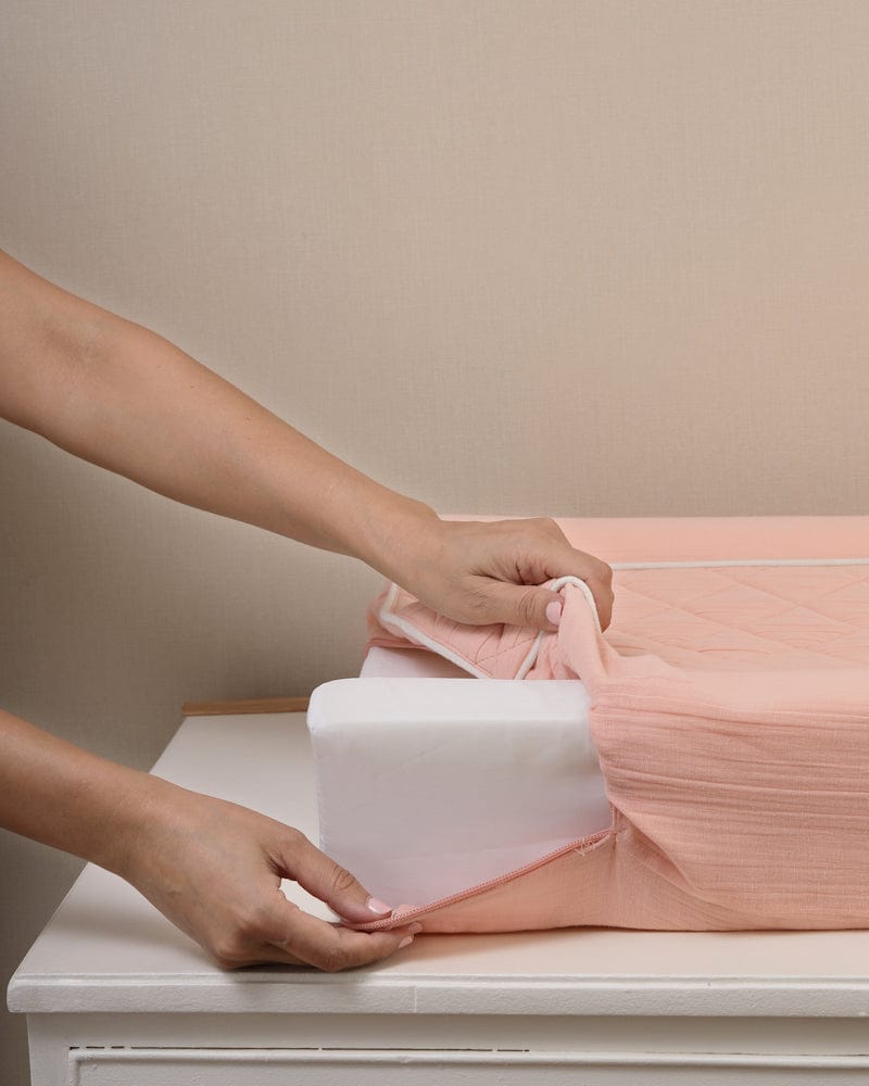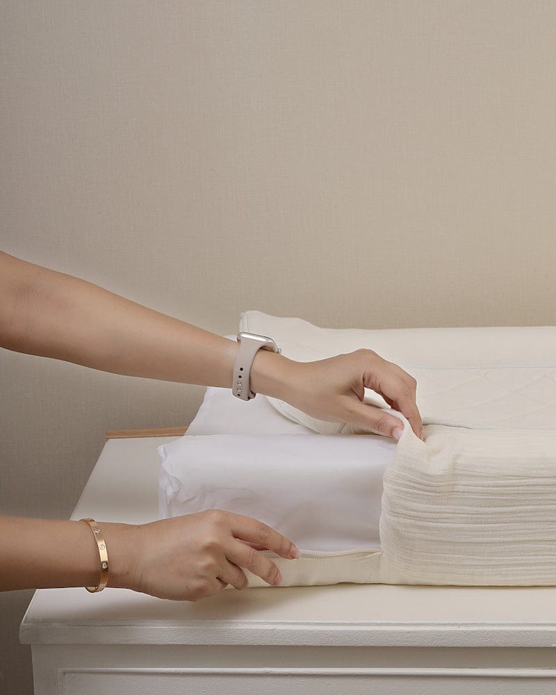الغطاء مصنوع من قماش موسلين عضوي ناعم، وفي الداخل يوجد إسفنجة ناعمة ولكنها ثابتة مع غطاء مقاوم للماء.