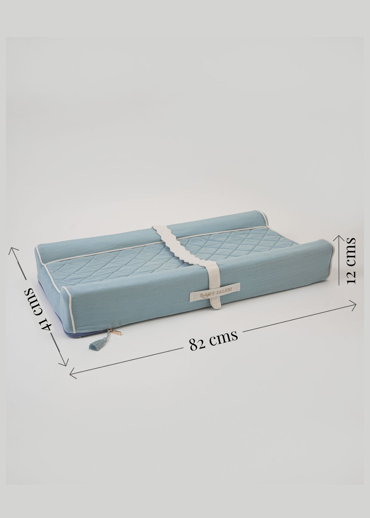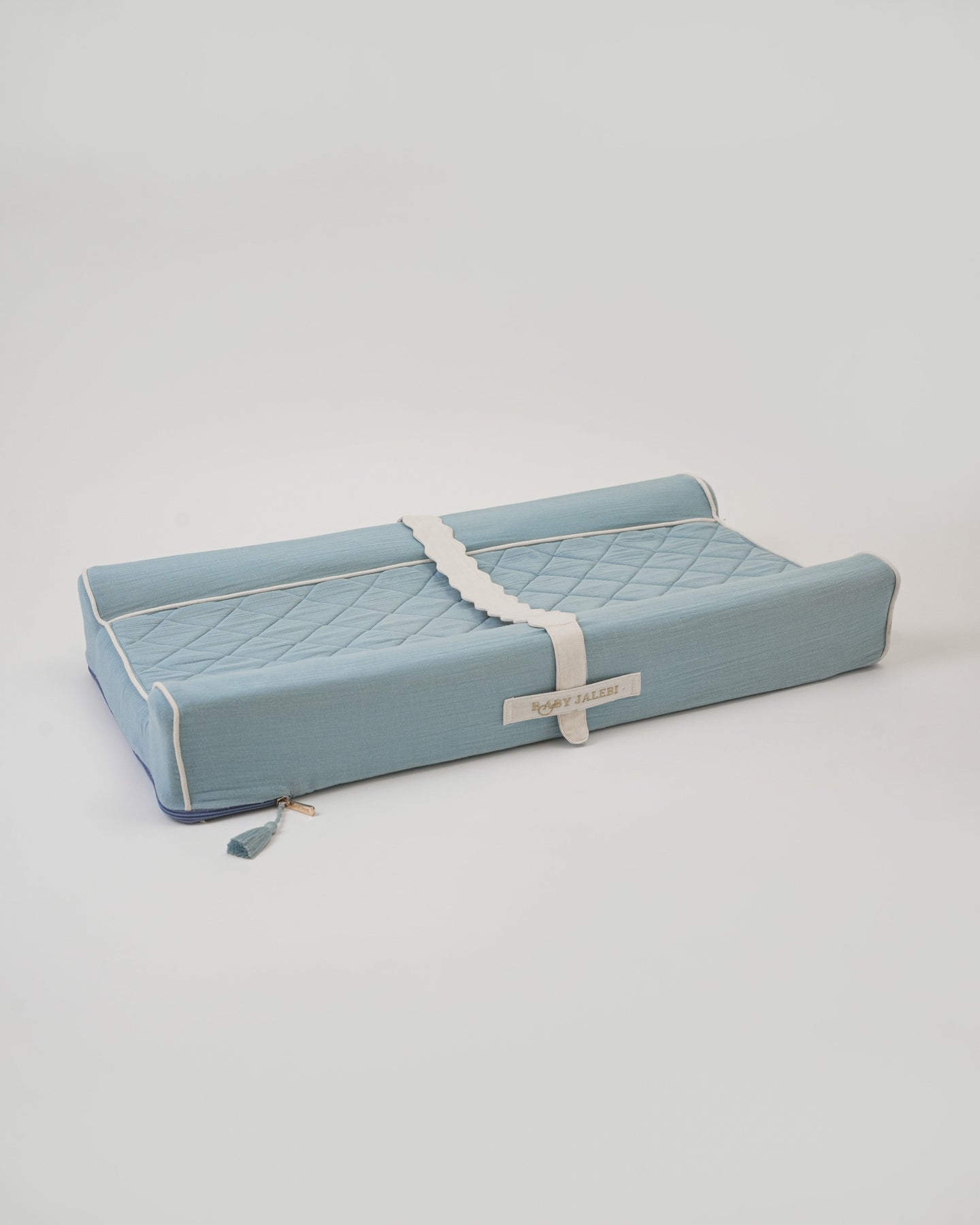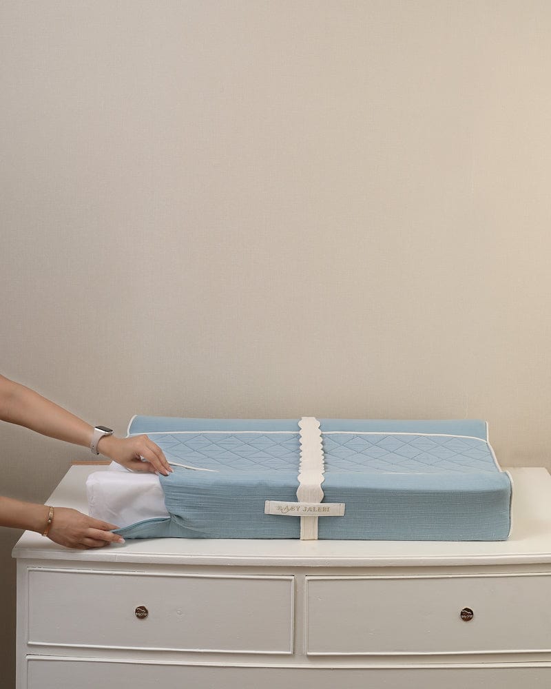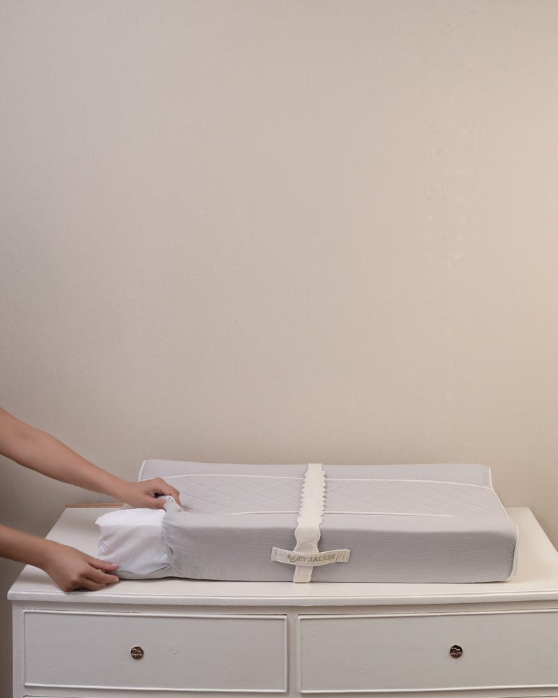 الغطاء مصنوع من قماش موسلين عضوي ناعم، وفي الداخل يوجد إسفنجة ناعمة ولكنها ثابتة مع غطاء مقاوم للماء.